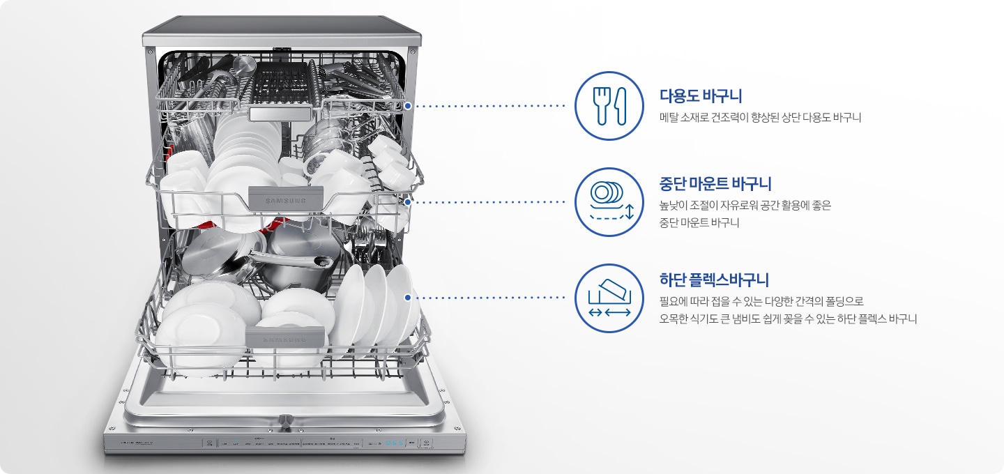 높이 조절이 가능한 식기바구니로 공간을 효율적으로 사용할 수 있죠.