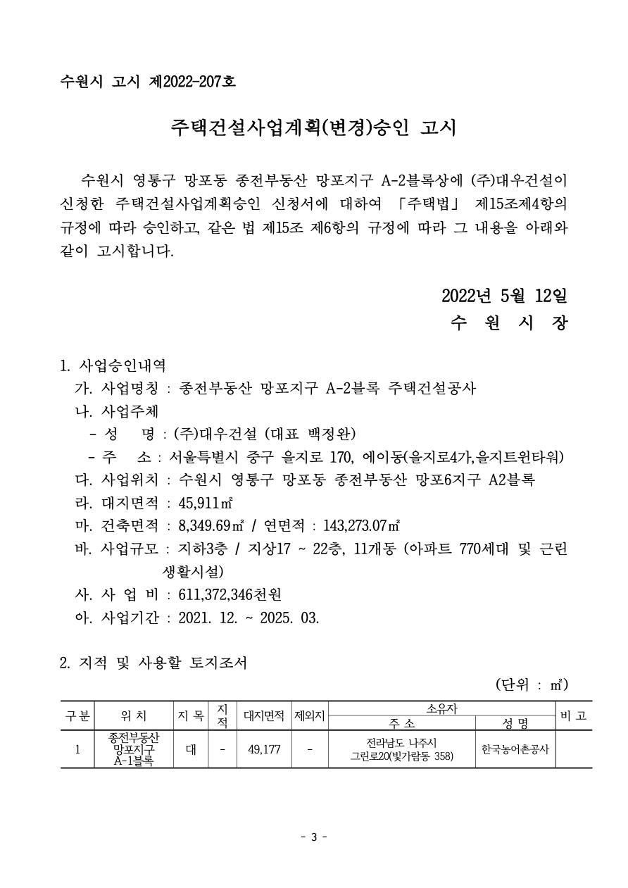 수원시 영통구 망포동 종전부동산 망포지구 A-2블록상에 (주)대우건설이 신청한 주택건설사업계획승인 신청서에 대하여 「주택법」 제15조제4항의 규정에 따라 승인하고, 같은 법 제15조 제6항의 규정에 따라 그 내용을 아래와 같이 고시합니다.