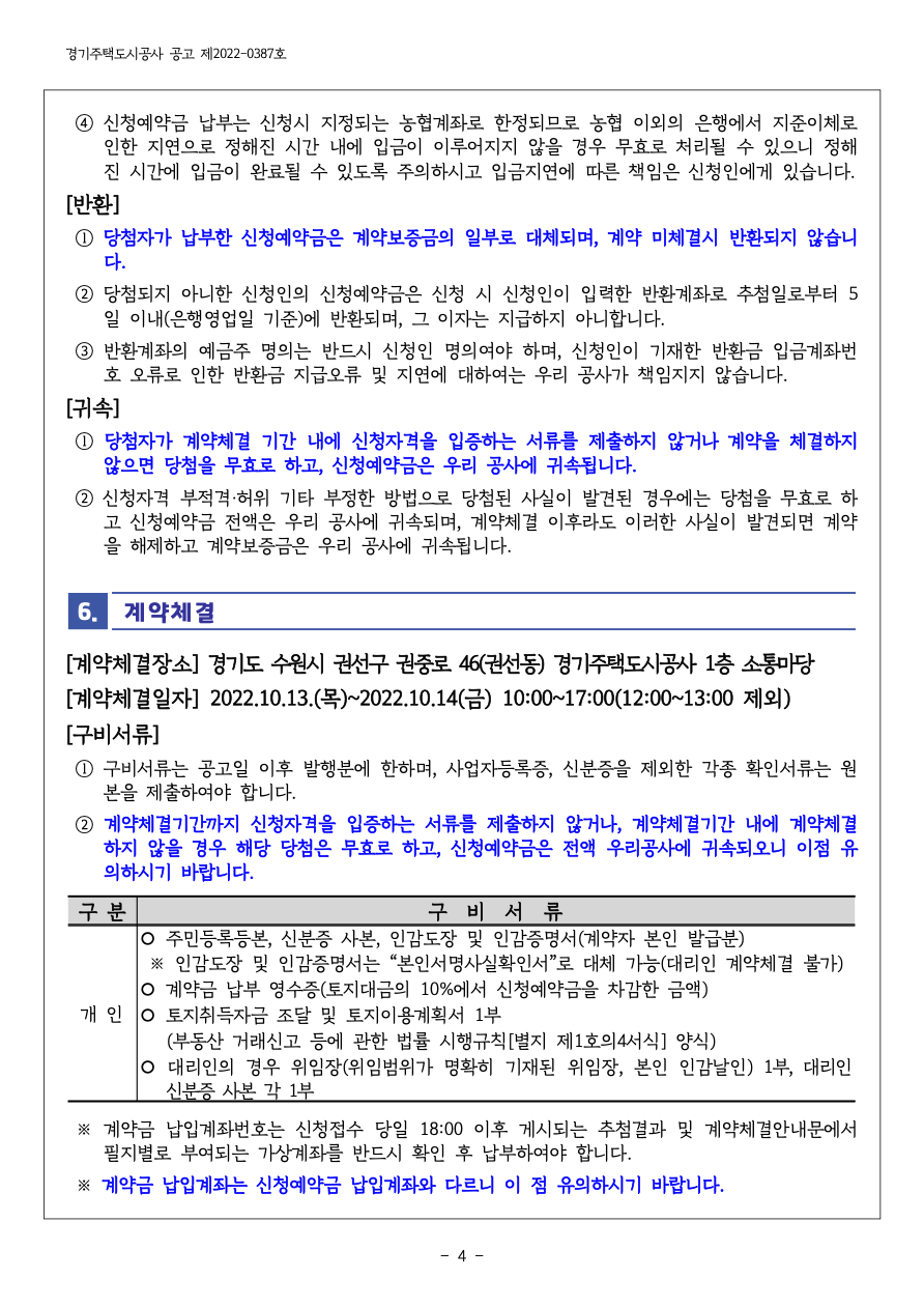 [계약체결장소] 경기도 수원시 권선구 권중로 46(권선동) 경기주택도시공사 1층 소통마당 [계약체결일자] 2022.10.13.(목)~2022.10.14(금) 10:00~17:00(12:00~13:00 제외) [구비서류]