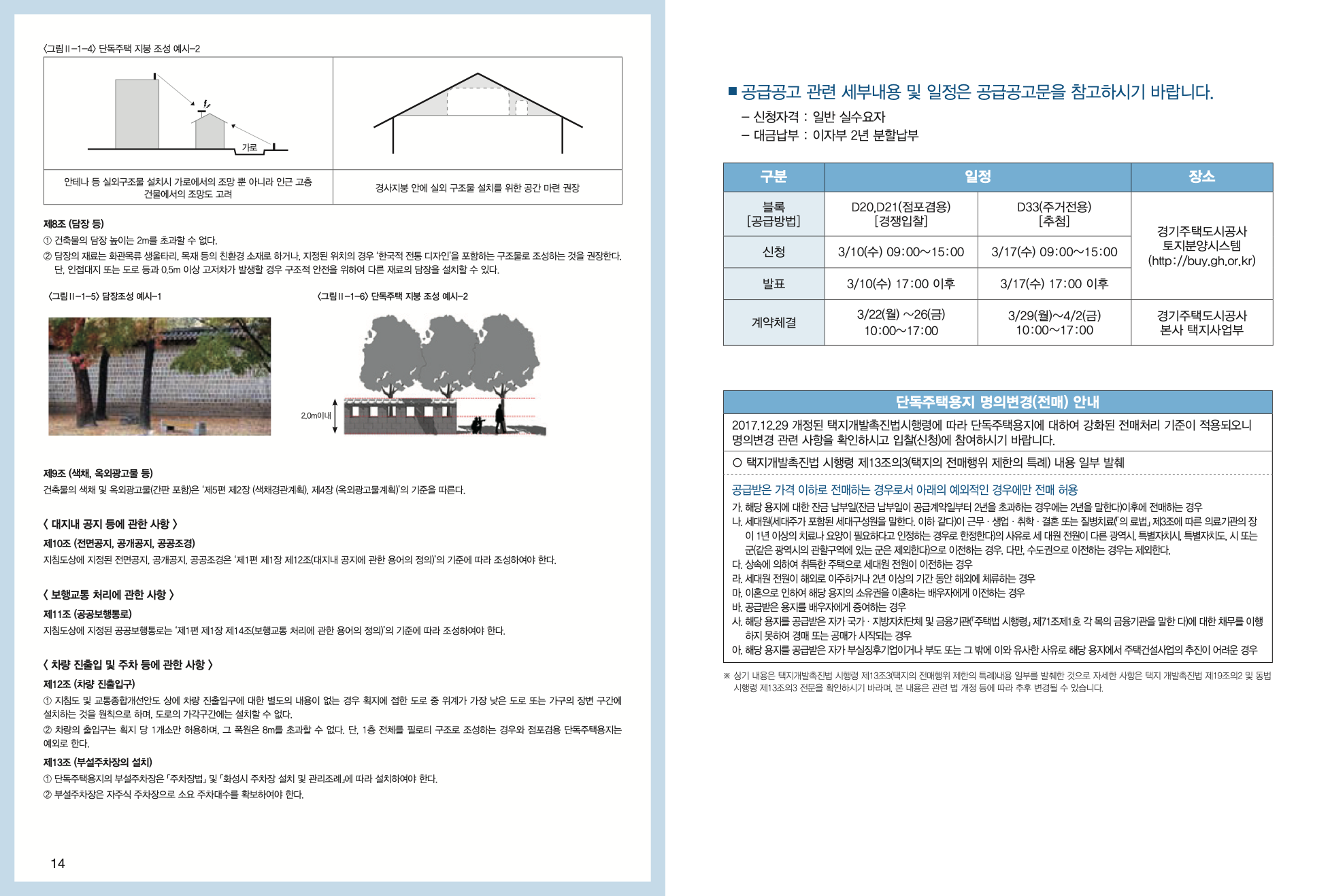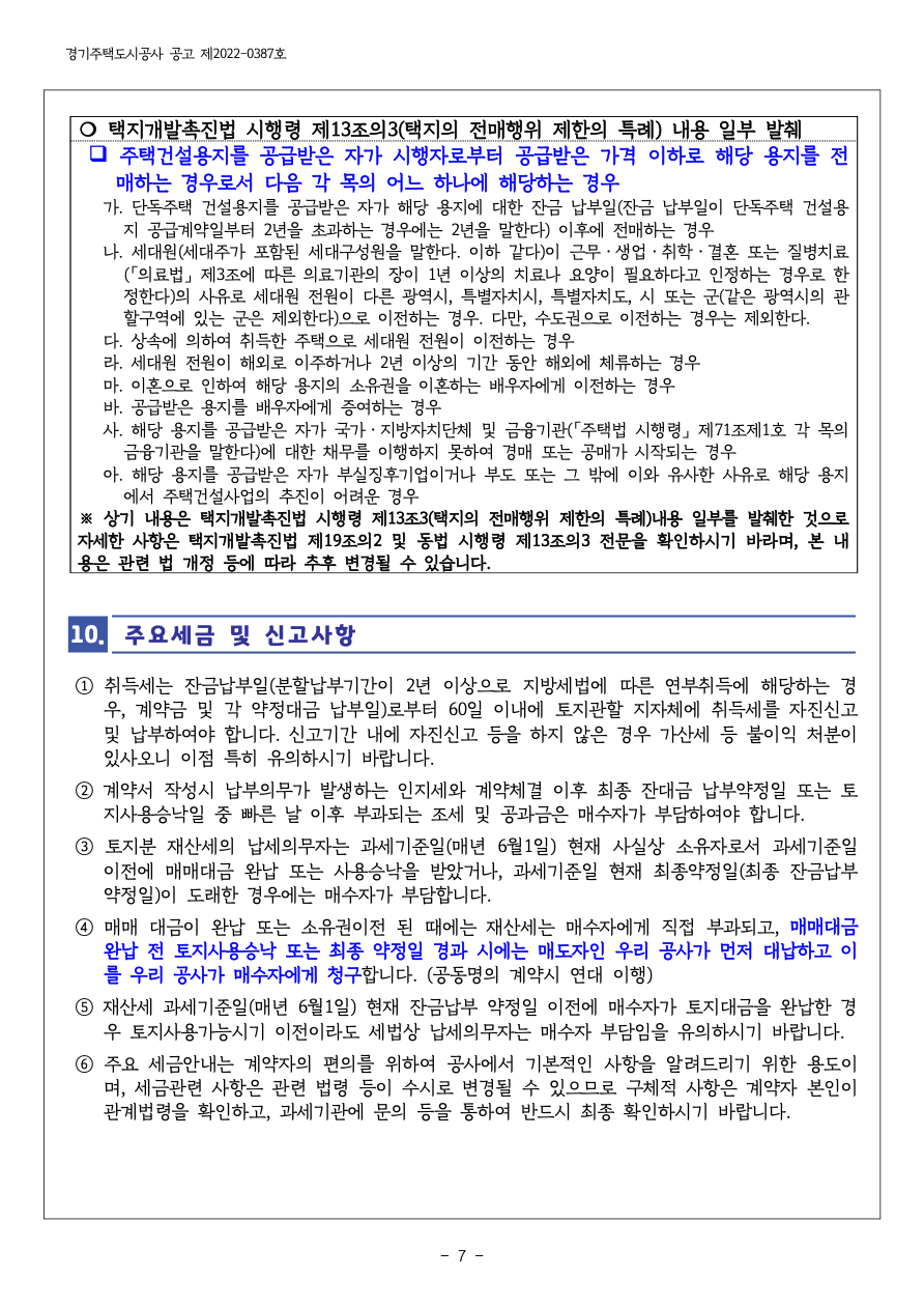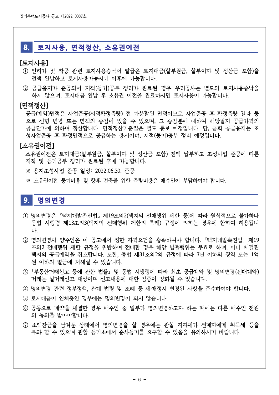 ※ 단독주택용지는 2017.12.29. 개정된 택지개발촉진법시행령에 따라 강화된 전매처리 기준이 적 용되오니 매수자(신청인)께서는 9번 명의변경 관련 사항을 반드시 확인하시기 바랍니다.