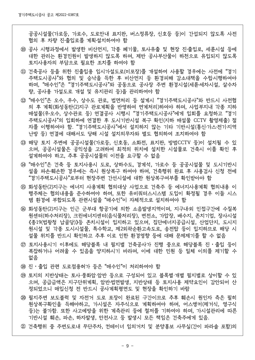 ⑨ “매수인”은 건축물을 신축함에 있어 시설물의 설치계획 및 공사추진계획 등 건축공사 시행 등 에 따르는 제반사항에 대하여 “경기주택도시공사”와 협의해야 하며, 차량 진․출입 부분에 대한 공공시설물(가로등, 가로수, 도로안내 표지판, 버스정류장, 신호등 등)이 간섭되지 않도록 사전 협의 후 차량 진․출입로를 계획․설치하여야 함