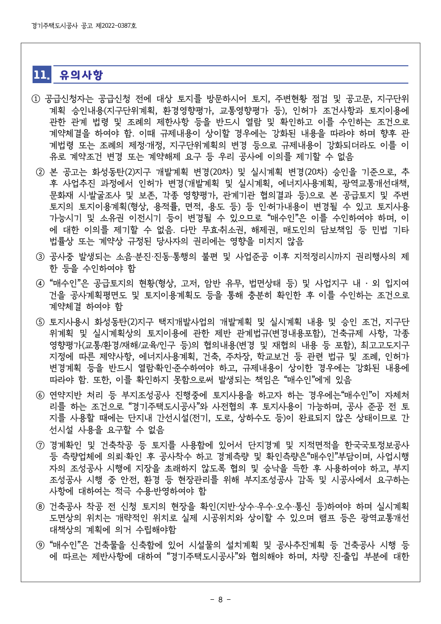 ⑥ 화성동탄(2) 택지개발사업의 사업준공시기는 공사진행상황 등을 고려하여 변경의 소지가 있으 며 용지매수자는 사업준공기간 연장에 따른 민원 등 어떠한 이의를 제기할 수 없음.