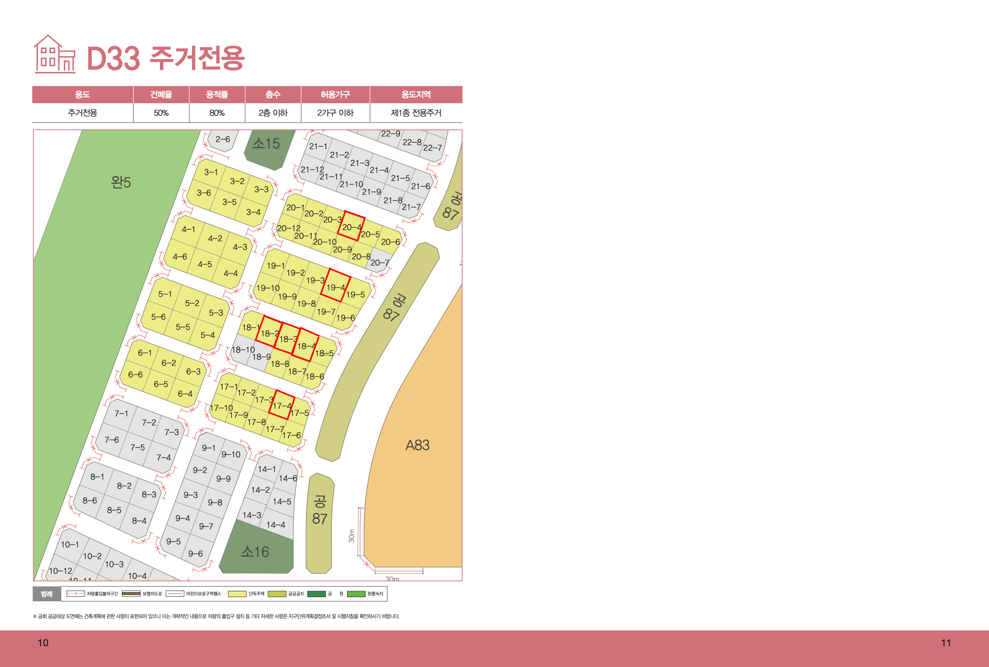 | D33-1704 (433-1804) | 180.2 | 354,093,000 | 50% 이하 | 80% 이하 | 2층 | 2가구 이하 | 제1종 전용주거 | 추첨 | 분할불허, 연접한 2획지 합병허용 |