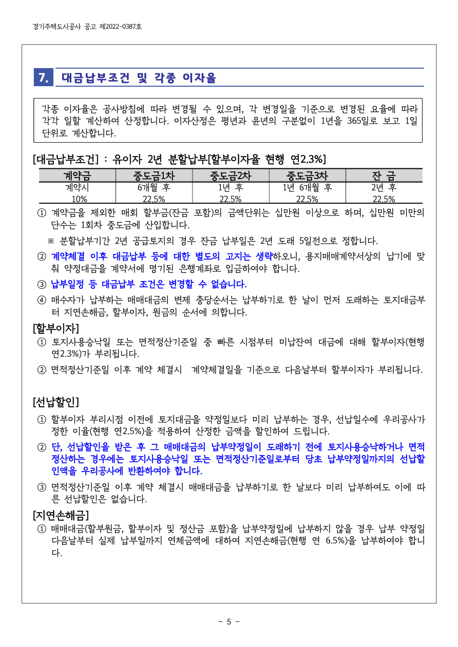 ※ 분할납부기간 2년 공급토지의 경우 잔금 납부일은 2년 도래 5일전으로 정합니다.
